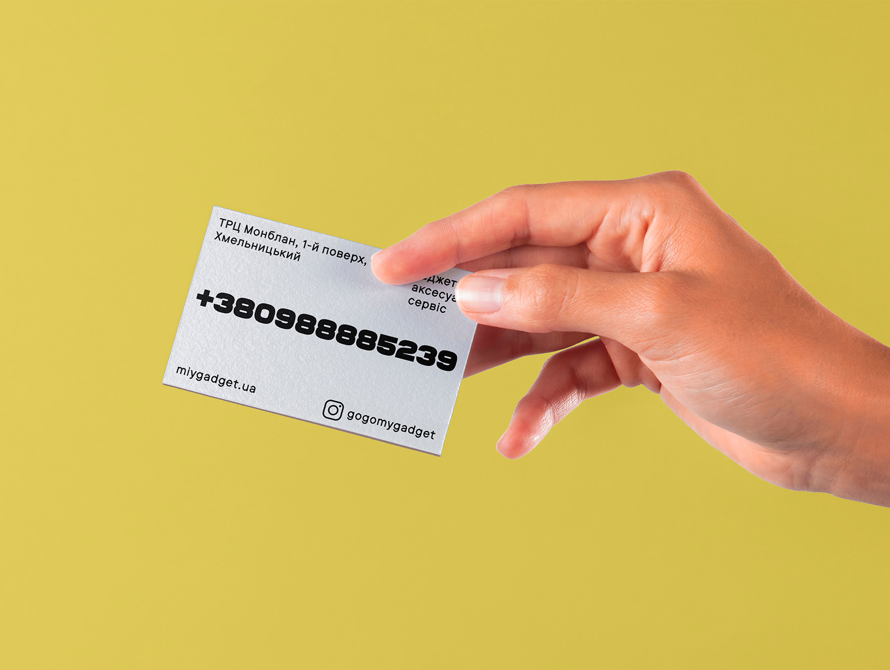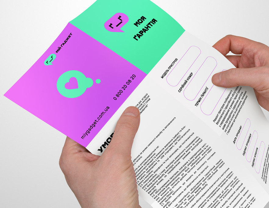 Для Мій Ґаджет ми розробили яскраві та впізнавані деталі: візитівку, дисконтну картку, гарантійний талон, подарунковий сертифікат та упакування.